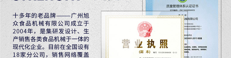 廣州旭眾食品機(jī)械有限公司是一家集科研開發(fā),生產(chǎn)設(shè)計(jì),營銷服務(wù)為一體的現(xiàn)代化生產(chǎn)企業(yè)?,F(xiàn)代化生產(chǎn)車間,精湛制造技術(shù),所產(chǎn)機(jī)械歷經(jīng)市場重重考驗(yàn),不斷贏得海內(nèi)外客戶的贊譽(yù)。