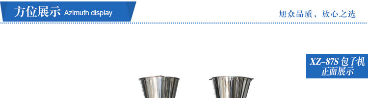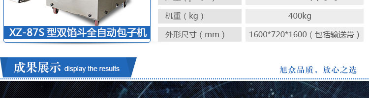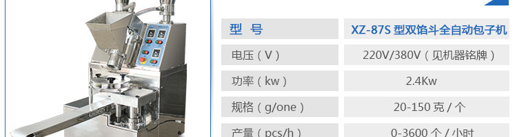 XZ-87S型雙餡斗全自動包子機,可生產(chǎn)各種肉包、肉菜包、菜包、小籠包、湯包、水晶包、圓饅頭、奶黃包、豆沙包、叉燒包、南瓜餅等幾十種包餡制品。適用于賓館、飯店、學校、機關企業(yè)食堂、饅頭或包子加工廠、早餐工程店及速凍食品廠等單位??蓾M足不同客戶群體。免費提供工藝技術。免費上門培訓指導安裝。