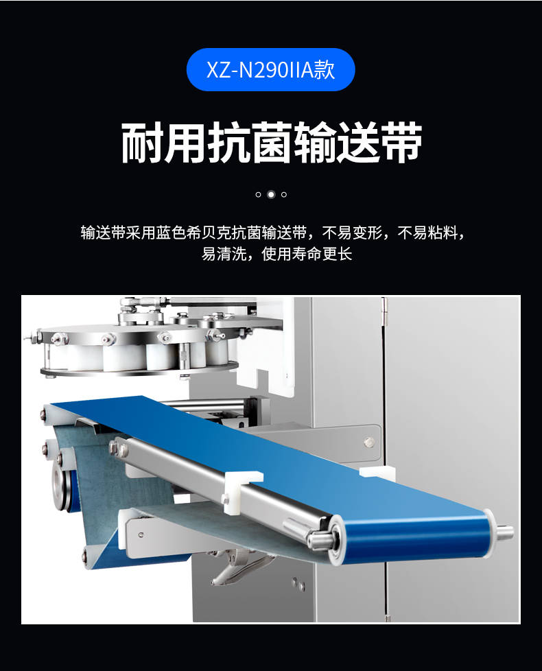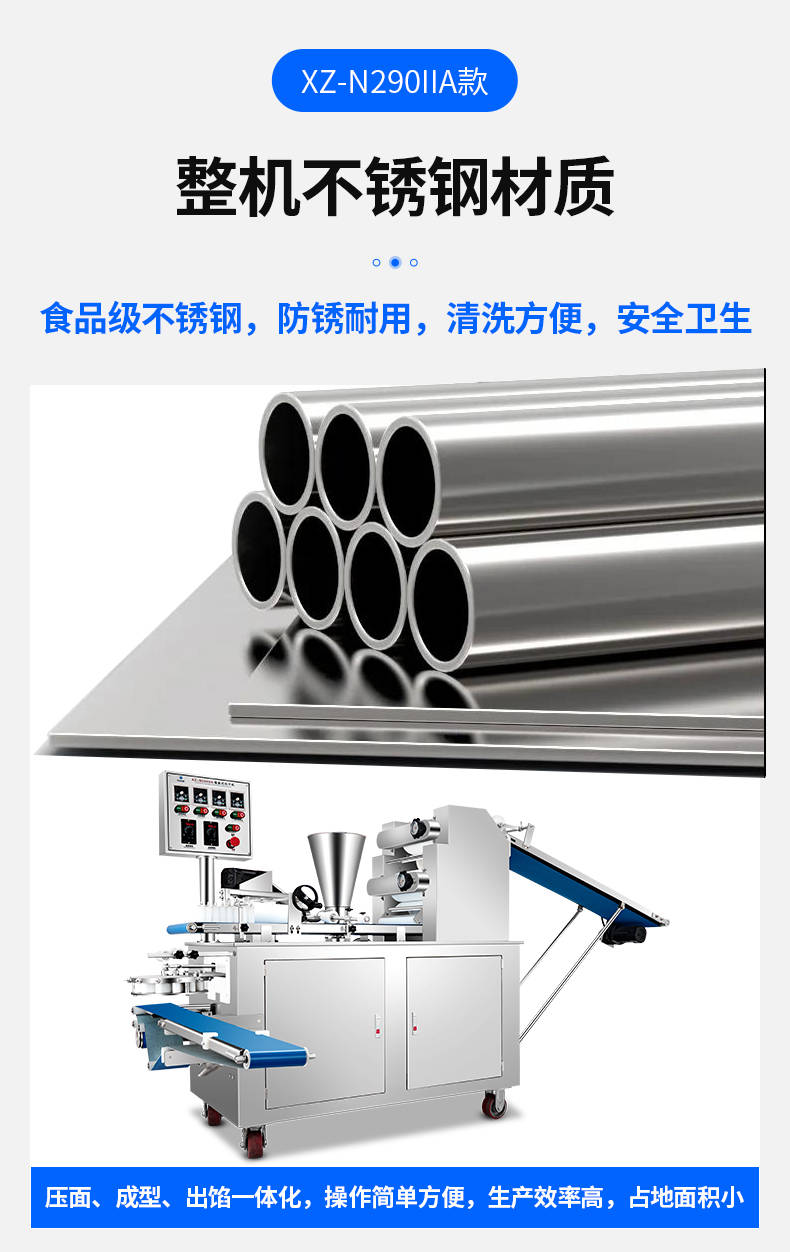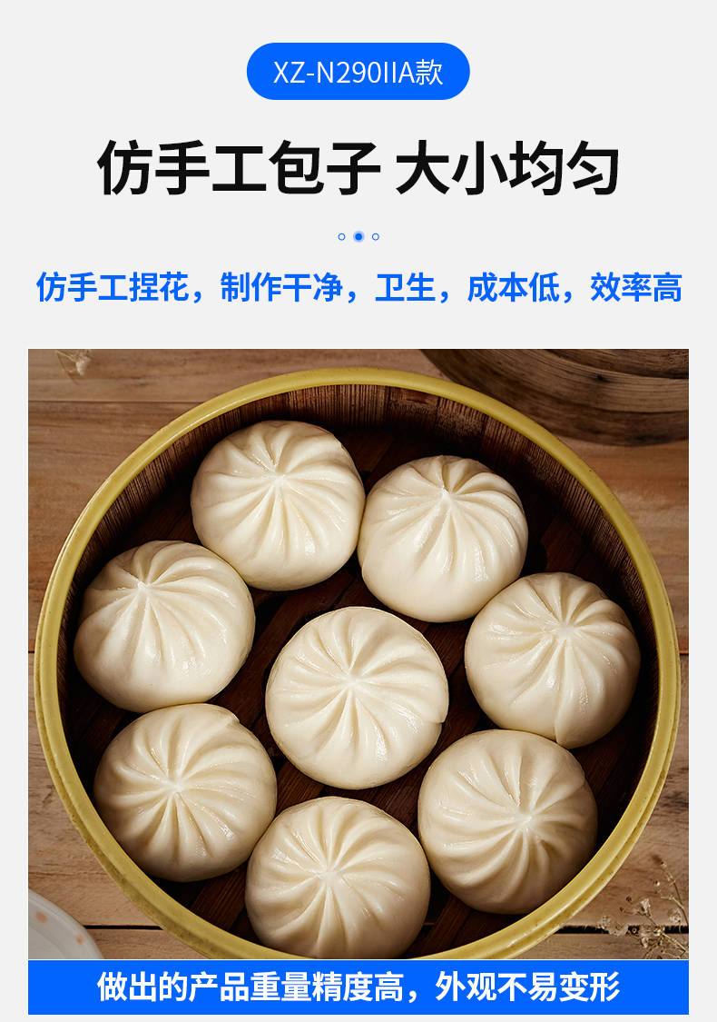 XZ-N290IIA卷面式包子機,壓面成型面皮,卷面方式包餡。仿手工捏花、一次成型、表面光滑、口感勁道。面餡可調(diào)、制品多樣。產(chǎn)品重量精度高,規(guī)格,大小,面皮的厚度皆可調(diào)控。