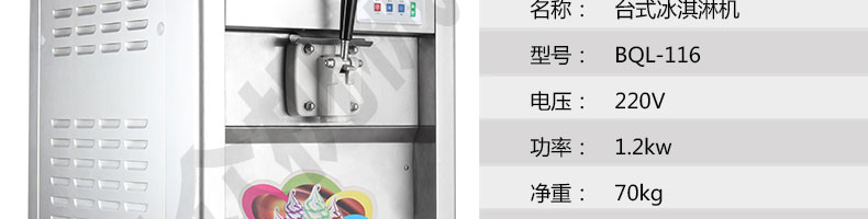 BQL-116臺(tái)式冰淇淋機(jī),●選用國(guó)際名牌成熟制冷配套件和高效壓縮機(jī),融合旭眾精湛工藝輔以嚴(yán)格的質(zhì)量控制流程,使產(chǎn)品整體性能及品質(zhì)得以全面提升。●采用全數(shù)字電腦控制系統(tǒng),選用名牌優(yōu)質(zhì)電器元件,先進(jìn)的生產(chǎn)工藝,故障診斷,軟硬任意調(diào)制,自動(dòng)修復(fù)功能,安全精確,可靠性更高。●專業(yè)成熟制冷系統(tǒng)設(shè)計(jì),選用世界名牌大功率專用壓縮機(jī),大大縮短冰淇淋成型時(shí)間,相同時(shí)間內(nèi)冰淇淋產(chǎn)量大幅度增加,使您生意火爆時(shí)依然得心應(yīng)手,為您創(chuàng)造財(cái)富?!癜踩椒€(wěn)的機(jī)械攪拌系統(tǒng),噪音更低、振動(dòng)更小,使整機(jī)運(yùn)行性能達(dá)到國(guó)際先進(jìn)水平?!翊_保進(jìn)料溫度在0°C~35°C;環(huán)境溫度5°C~40°C勻可正常使用。