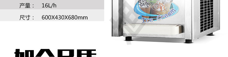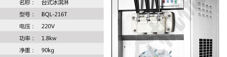 名稱BQL-216T臺式冰淇淋機 電源220V 功率1.8kw 產(chǎn)量16L/h 尺寸600*430*680mm 重量92kg 規(guī)格 其他