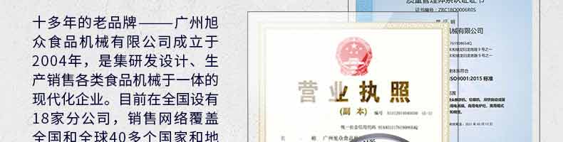 廣州旭眾食品機械有限公司是一家集科研開發(fā),生產(chǎn)設計,營銷服務為一體的現(xiàn)代化生產(chǎn)企業(yè)。現(xiàn)代化生產(chǎn)車間,精湛制造技術,所產(chǎn)機械歷經(jīng)市場重重考驗,不斷贏得海內(nèi)外客戶的贊譽。