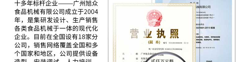 廣州旭眾食品機(jī)械有限公司是一家集科研開發(fā),生產(chǎn)設(shè)計(jì),營銷服務(wù)為一體的現(xiàn)代化生產(chǎn)企業(yè)?,F(xiàn)代化生產(chǎn)車間,精湛制造技術(shù),所產(chǎn)機(jī)械歷經(jīng)市場重重考驗(yàn),不斷贏得海內(nèi)外客戶的贊譽(yù)。
