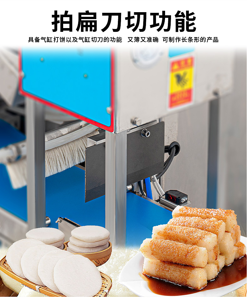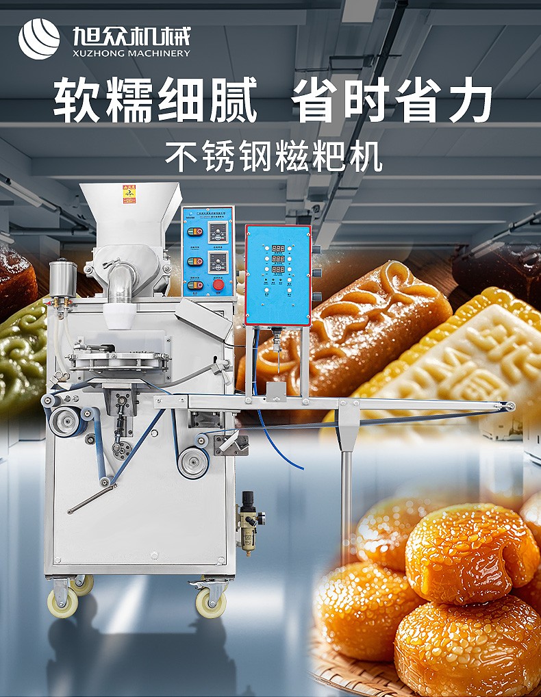 XZ-5000C糍粑機(jī),軟糯細(xì)膩、省時(shí)省力,不銹鋼糍粑機(jī)。智能控制面板,智能內(nèi)芯控制,可自由調(diào)節(jié)輸送,切刀和打餅的時(shí)間。拍扁刀切功能,具備氣缸打餅以及氣缸切刀的功能、又薄又準(zhǔn)確、可制作長(zhǎng)條形的產(chǎn)品。