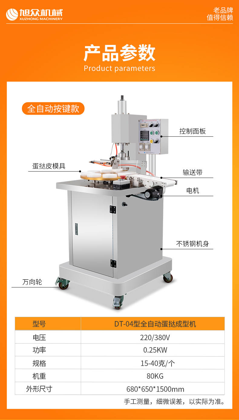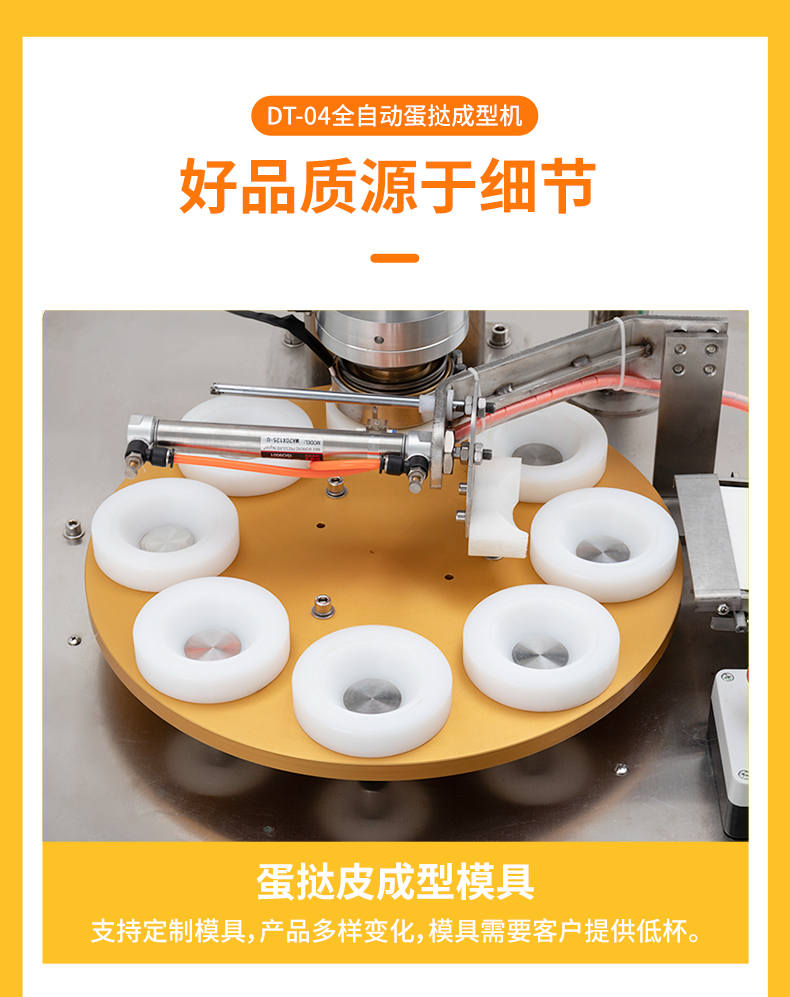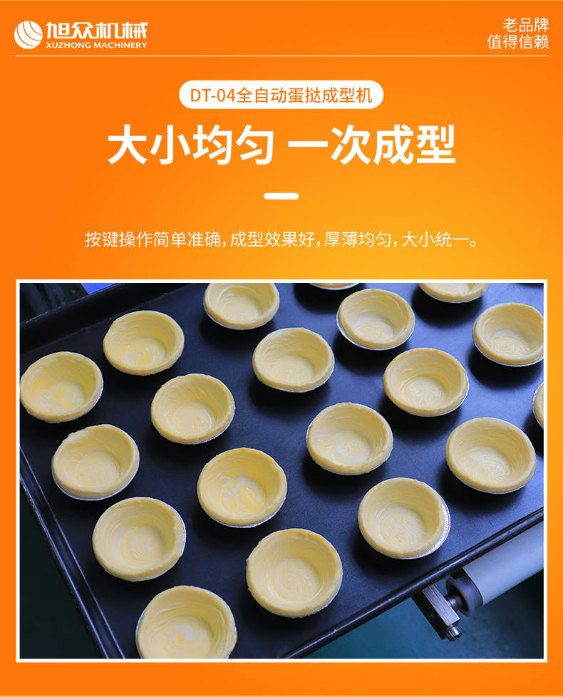 DT-04全自動蛋撻成型機,2-3秒快速成型。該機應(yīng)用于傳統(tǒng)蛋撻、葡式蛋撻及其它須印型之產(chǎn)品突破傳統(tǒng)用手捏,采用微電子控制成型,一個2-3秒,高效率。大小均勻一次成型按鍵操作簡單準(zhǔn)確,成型效果好,厚薄均勻,大小統(tǒng)-。層層起酥層次分明好葡式蛋撻皮,千層酥皮、松脆可口、唇齒留香、一口難忘。