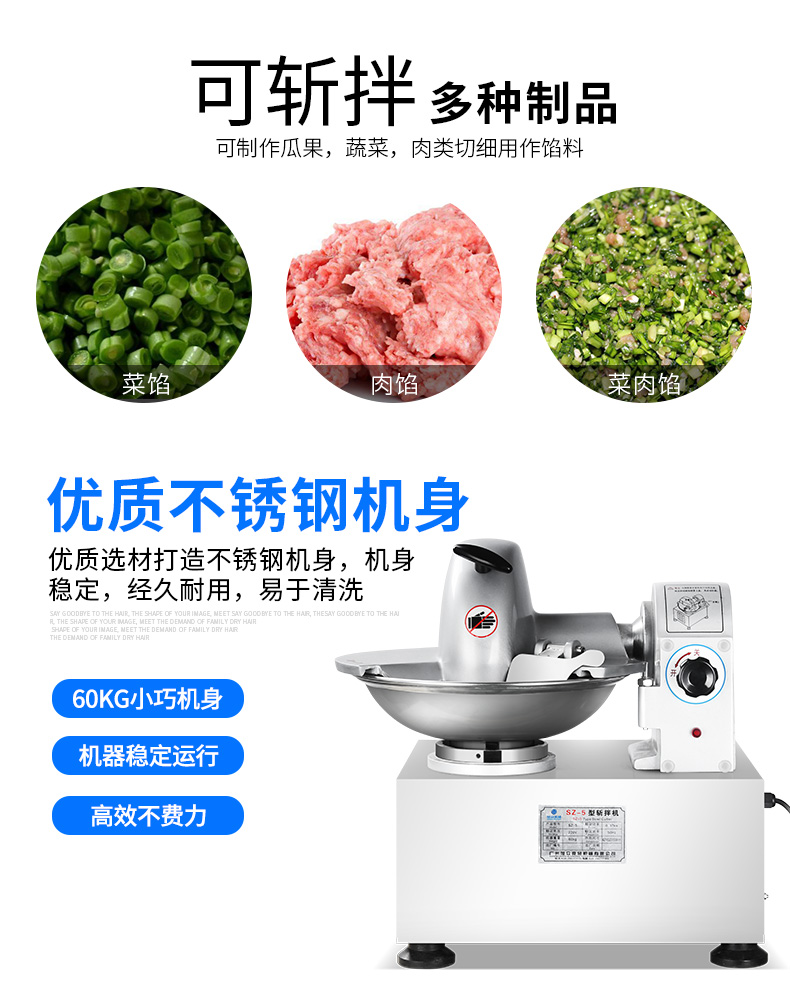 SZ-5型斬拌機(jī),全自動斬拌機(jī),高效安全、節(jié)能便捷、適用于制作各種餡料??蓴匕瓒喾N制品,可制作瓜果,蔬菜,肉類切細(xì)用作餡料。優(yōu)質(zhì)選材打造不銹鋼機(jī)身,機(jī)身穩(wěn)定,經(jīng)久耐用,易于清洗。