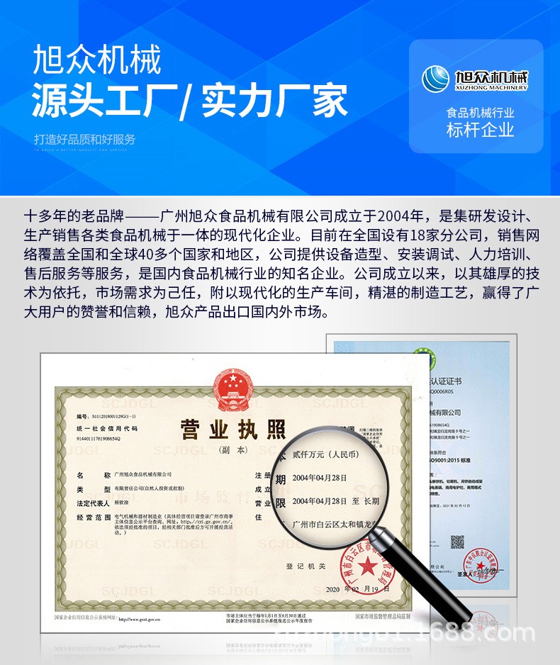 廣州旭眾食品機(jī)械有限公司是一家集科研開發(fā),生產(chǎn)設(shè)計,營銷服務(wù)為一體的現(xiàn)代化生產(chǎn)企業(yè)。現(xiàn)代化生產(chǎn)車間,精湛制造技術(shù),所產(chǎn)機(jī)械歷經(jīng)市場重重考驗,不斷贏得海內(nèi)外客戶的贊譽(yù)。