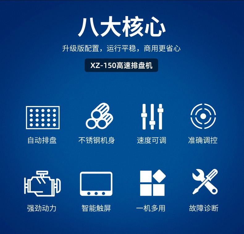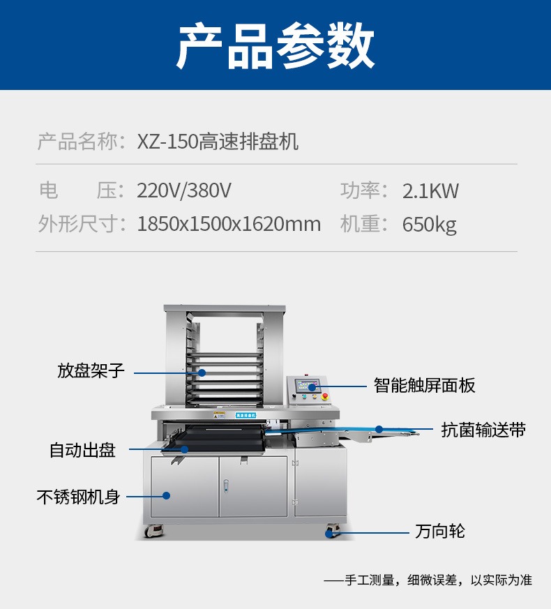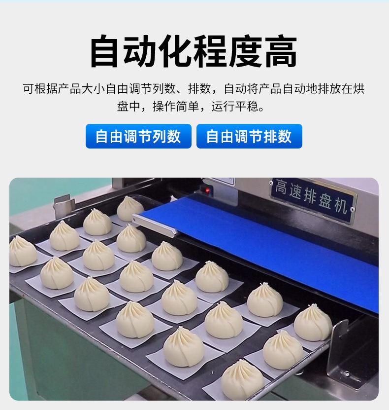 多功能商用高速排盤機(jī),自動(dòng)化程度高,可根據(jù)產(chǎn)品大小自由調(diào)節(jié)列數(shù)、排數(shù),自動(dòng)將產(chǎn)品自動(dòng)地排放在烘盤中,操作簡(jiǎn)單,運(yùn)行平穩(wěn)。智能觸屏面板。控制系統(tǒng)由三菱PLC和進(jìn)口觸摸屏組成,操作簡(jiǎn)單方便。具有故障自動(dòng)診斷,一目了然。