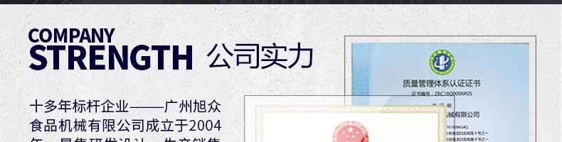 廣州旭眾食品機(jī)械有限公司是一家集科研開發(fā),生產(chǎn)設(shè)計(jì),營銷服務(wù)為一體的現(xiàn)代化生產(chǎn)企業(yè)?,F(xiàn)代化生產(chǎn)車間,精湛制造技術(shù),所產(chǎn)機(jī)械歷經(jīng)市場(chǎng)重重考驗(yàn),不斷贏得海內(nèi)外客戶的贊譽(yù)。