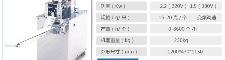名稱JGB-120-5A型輸送帶餃子機(jī) 電源220/380V(見(jiàn)機(jī)器名牌) 功率2.2kw(220V)1.5KW(380V) 產(chǎn)量0-8600個(gè)/小時(shí) 尺寸外形尺寸1500*460*1190mm 重量230kg 規(guī)格15-20克/個(gè) 其他