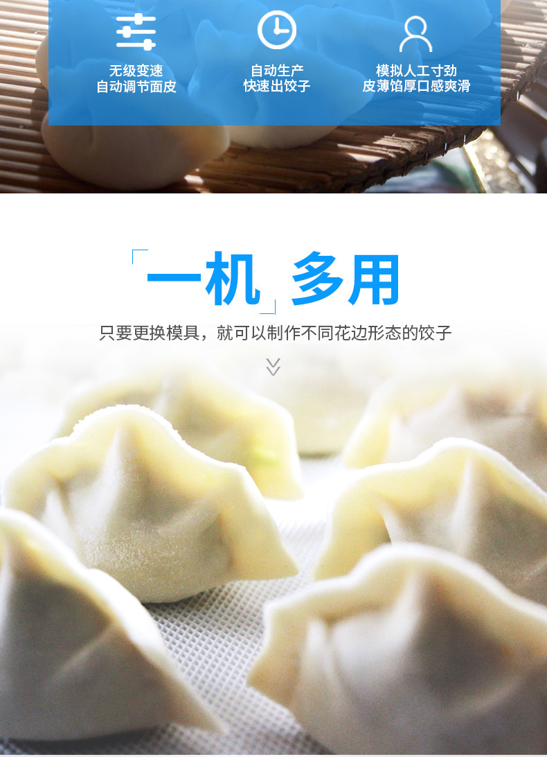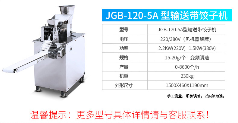 JGB-210型仿手工餃子機,本機采用自動壓面皮包餃子的新工藝技術,本機可生產速凍餃子等,能生產各種肉餡、肉菜混合餡、全菜餡及其他種餡的餃子,適用于餃子館、食品生產廠家、賓館、飯店、餐廳、團體食堂、學校、部隊。免費上門安裝調試,贈送面點工藝