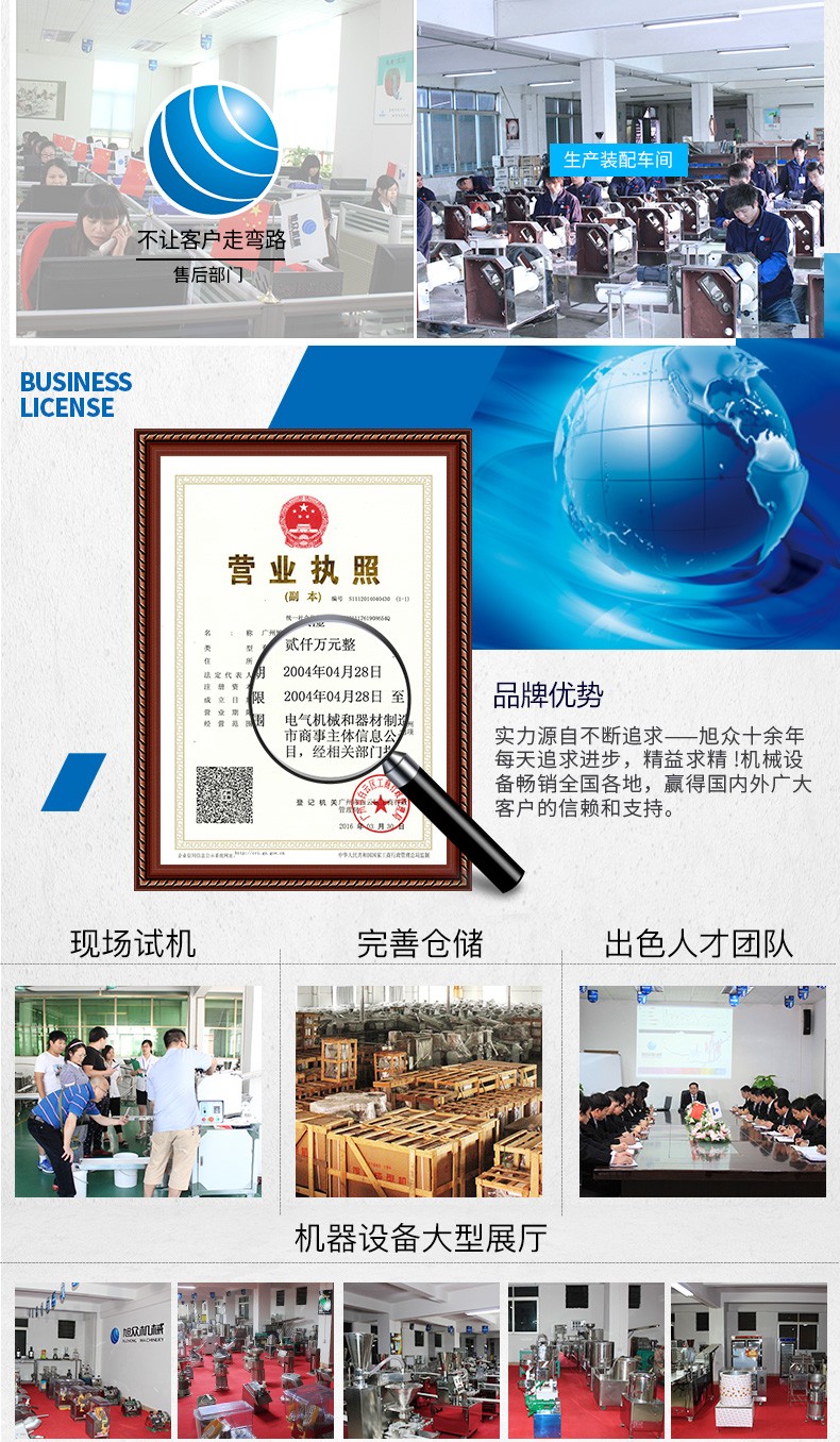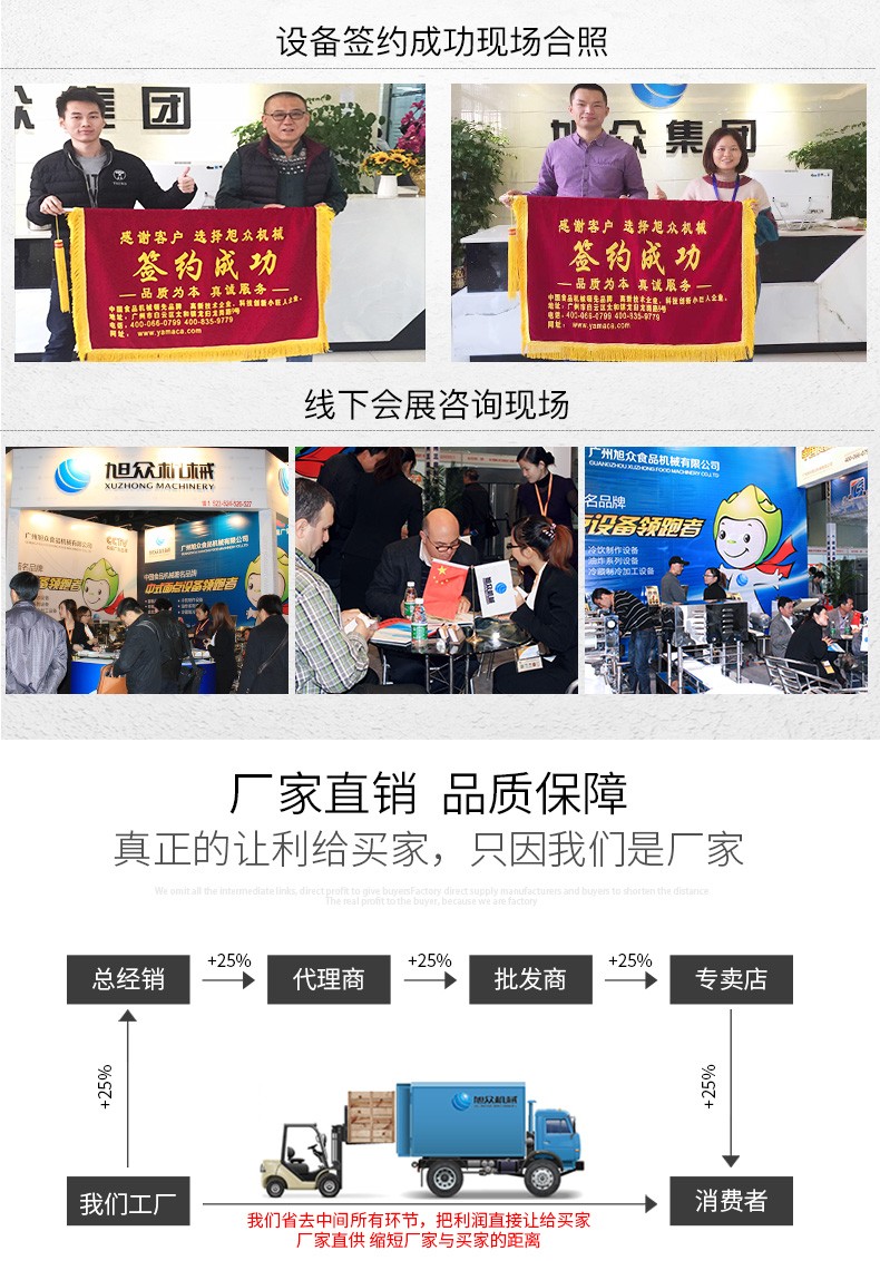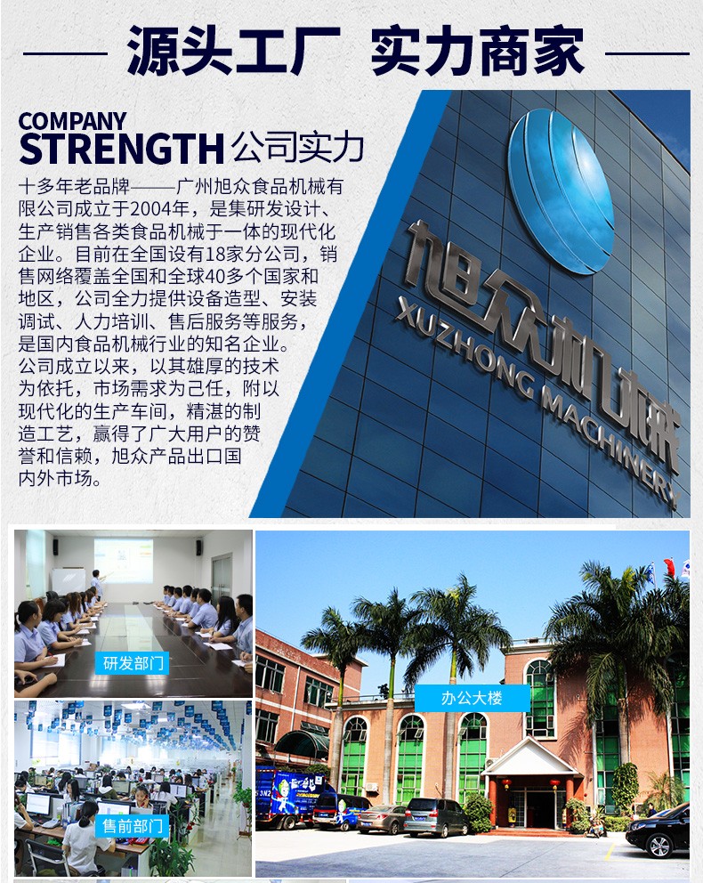 廣州旭眾食品機械有限公司是一家集科研開發(fā),生產設計,營銷服務為一體的現(xiàn)代化生產企業(yè)?,F(xiàn)代化生產車間,精湛制造技術,所產機械歷經市場重重考驗,不斷贏得海內外客戶的贊譽。
