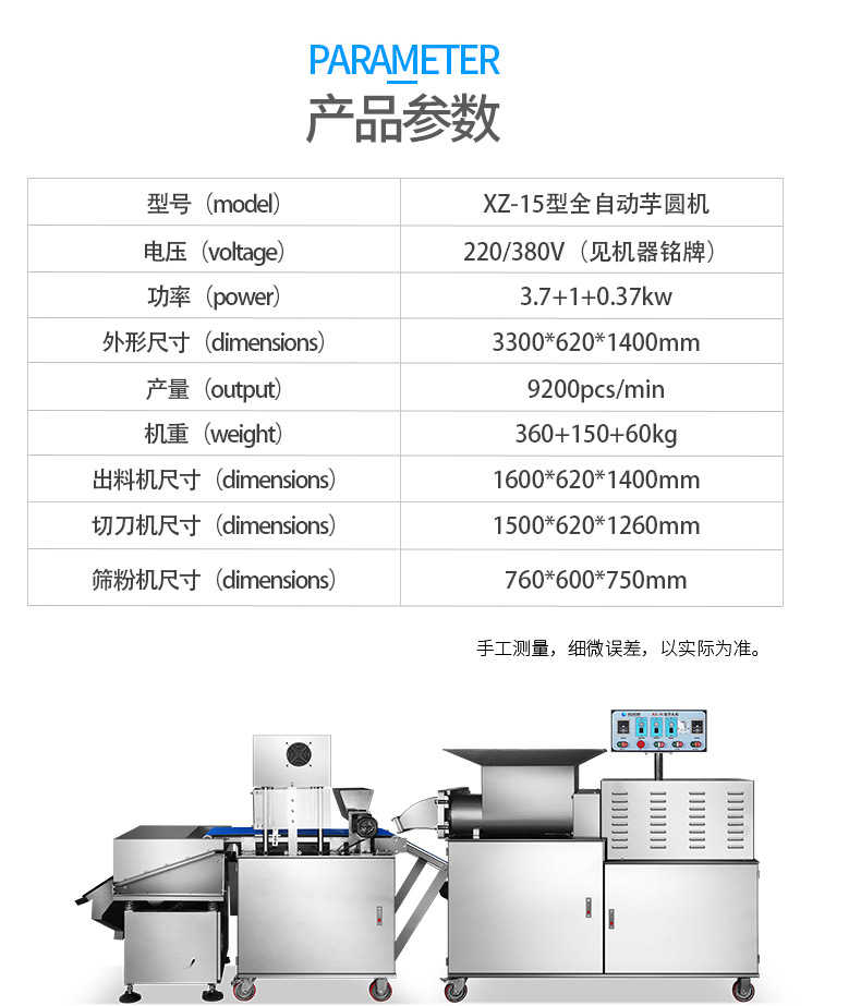 名稱XZ-15 芋圓機 電源220/380V(見機器銘牌) 功率3.7+1+0.37kW 產(chǎn)量9200pcs/min 尺寸3300*620*1400mm 重量360+150+60kg 規(guī)格聯(lián)系銷售員 其他