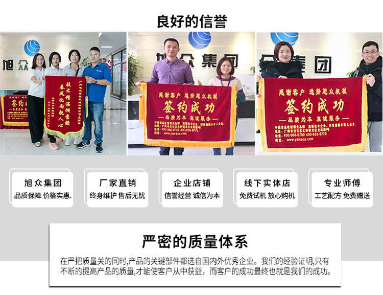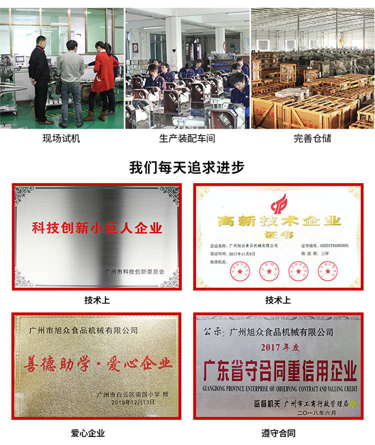 廣州旭眾食品機(jī)械有限公司是一家集科研開(kāi)發(fā),生產(chǎn)設(shè)計(jì),營(yíng)銷(xiāo)服務(wù)為一體的現(xiàn)代化生產(chǎn)企業(yè)。現(xiàn)代化生產(chǎn)車(chē)間,精湛制造技術(shù),所產(chǎn)機(jī)械歷經(jīng)市場(chǎng)重重考驗(yàn),不斷贏得海內(nèi)外客戶(hù)的贊譽(yù)。