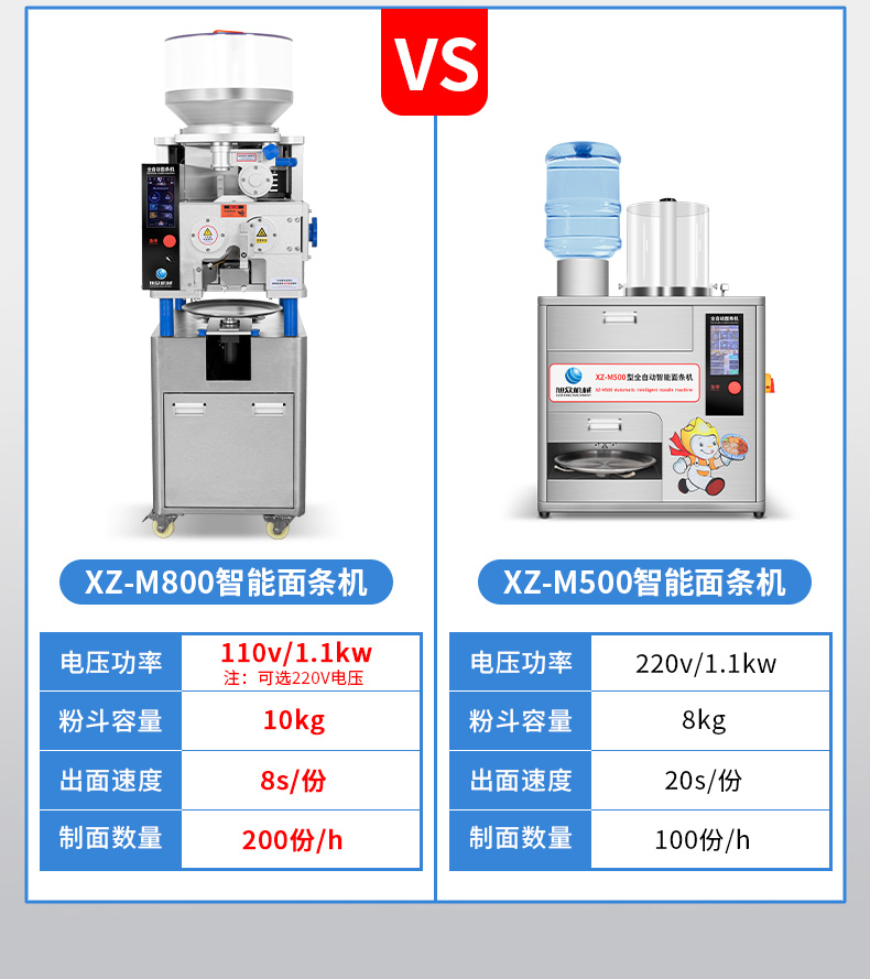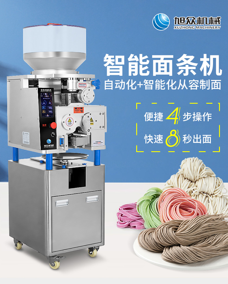 XZ-M800面條機,制作多種面條:拉面、小面、牛肉面、韭葉面板面、褲帯面、蔬菜面、水果面、雜糧面8秒快速出面人性化設計,更便捷更高效與同類型機器相比,出面更快、秒換刀具。全不銹鋼刀組全不銹鋼可拆卸刀組,一秒更換防腐蝕抗氧化,清洗方便。