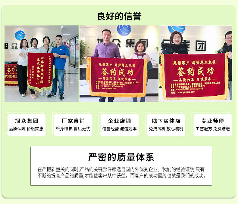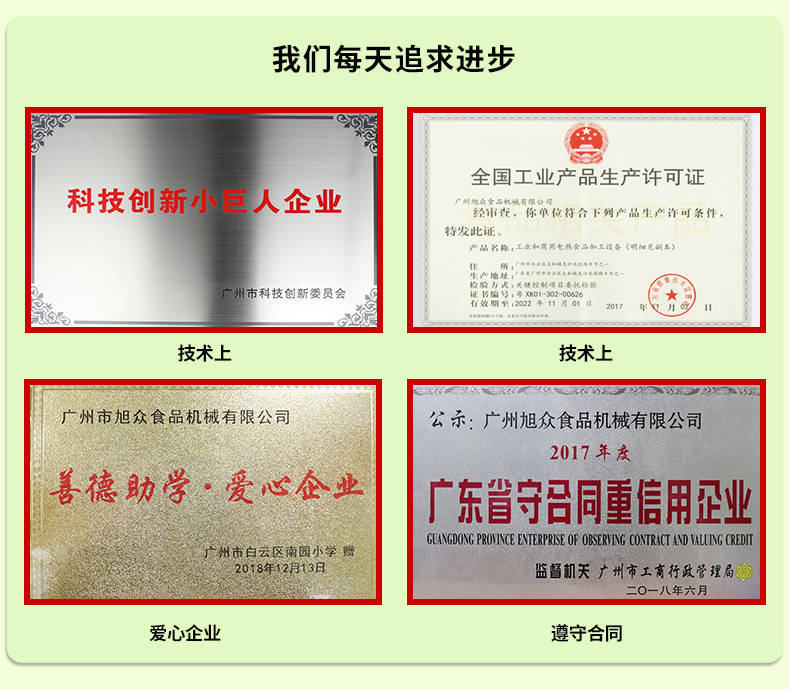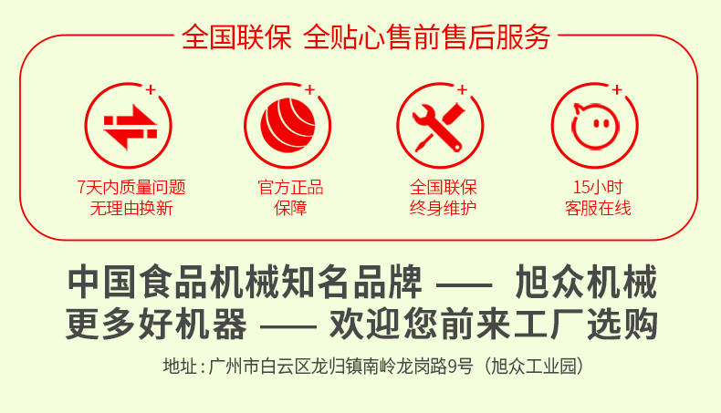 廣州旭眾食品機(jī)械有限公司是一家集科研開(kāi)發(fā),生產(chǎn)設(shè)計(jì),營(yíng)銷(xiāo)服務(wù)為一體的現(xiàn)代化生產(chǎn)企業(yè)。現(xiàn)代化生產(chǎn)車(chē)間,精湛制造技術(shù),所產(chǎn)機(jī)械歷經(jīng)市場(chǎng)重重考驗(yàn),不斷贏得海內(nèi)外客戶的贊譽(yù)。
