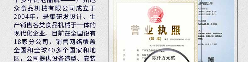 廣州旭眾食品機械有限公司是一家集科研開發(fā),生產(chǎn)設計,營銷服務為一體的現(xiàn)代化生產(chǎn)企業(yè)。現(xiàn)代化生產(chǎn)車間,精湛制造技術(shù),所產(chǎn)機械歷經(jīng)市場重重考驗,不斷贏得海內(nèi)外客戶的贊譽。