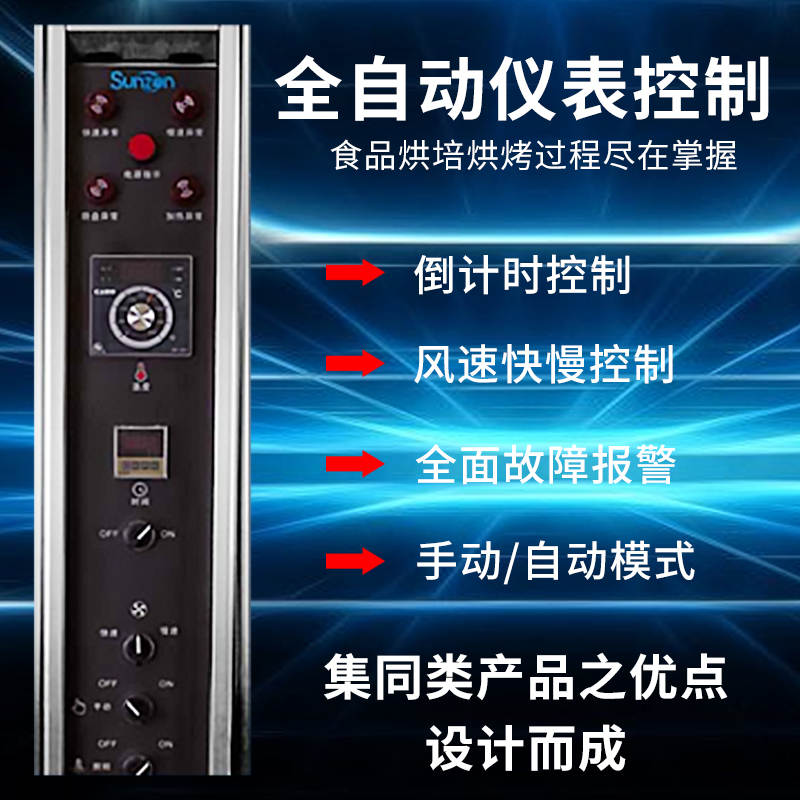 XZ-32-32層旋轉(zhuǎn)烤爐,360°熱風(fēng)環(huán)流系統(tǒng)立體熱風(fēng)循環(huán),加熱更高效,食品成色更誘人。全自動儀表控制,食品烘培烘烤過程盡在掌握。倒計時控制、風(fēng)速快慢控制、全面障報警。
