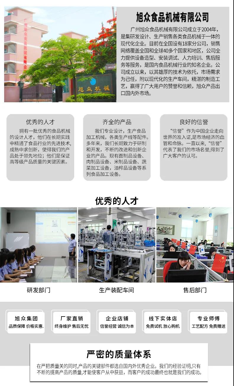 廣州旭眾食品機(jī)械有限公司是一家集科研開(kāi)發(fā),生產(chǎn)設(shè)計(jì),營(yíng)銷(xiāo)服務(wù)為一體的現(xiàn)代化生產(chǎn)企業(yè)?,F(xiàn)代化生產(chǎn)車(chē)間,精湛制造技術(shù),所產(chǎn)機(jī)械歷經(jīng)市場(chǎng)重重考驗(yàn),不斷贏得海內(nèi)外客戶(hù)的贊譽(yù)。
