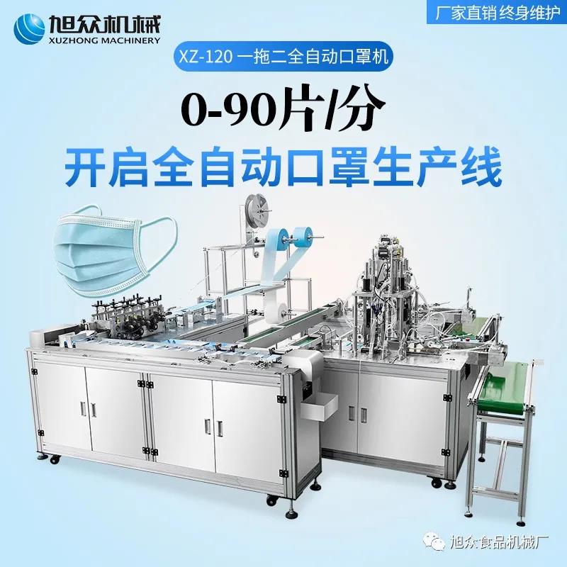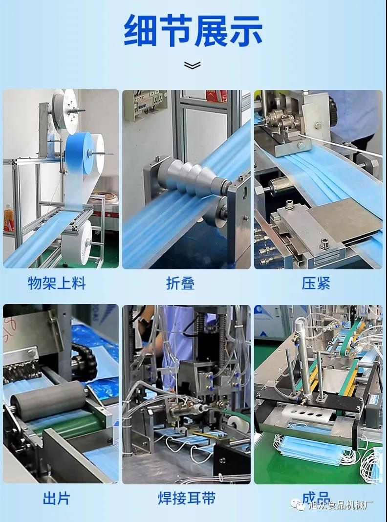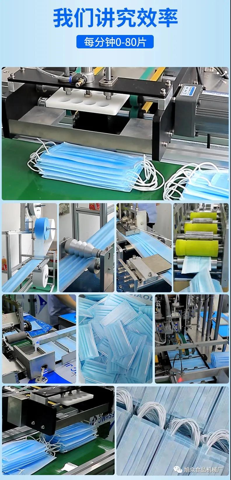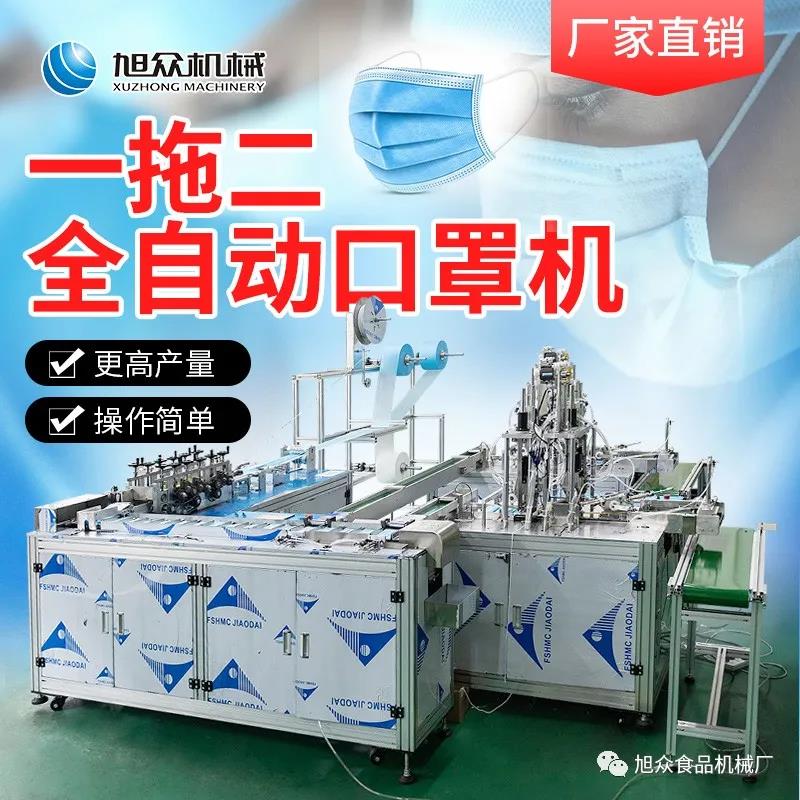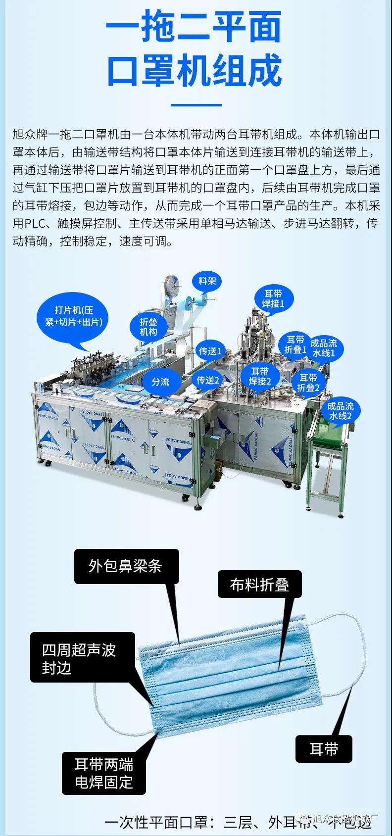 旭眾牌一拖二口罩機由一臺本體機帶動兩臺耳帶機組成。本體機輸出ロ罩本體后,由輸送帶結(jié)構(gòu)將口罩本體片輸送到連接耳帶機的輸送帶上,再通過輸送帶將口罩片輸送到耳帶機的正面第一個口罩盤上方,最后通過氣缸下壓把口罩片放置到耳帶機的口罩盤內(nèi),后續(xù)由耳帶機完成口罩的耳帶熔接,包邊等動作,從而完成一個耳帶口罩產(chǎn)品的生產(chǎn)。本機采用PLC、觸摸屏控制、主傳送帶采用單相馬達(dá)輸送、步進馬達(dá)翻轉(zhuǎn),傳動精確,控制穩(wěn)定,速度可調(diào)。