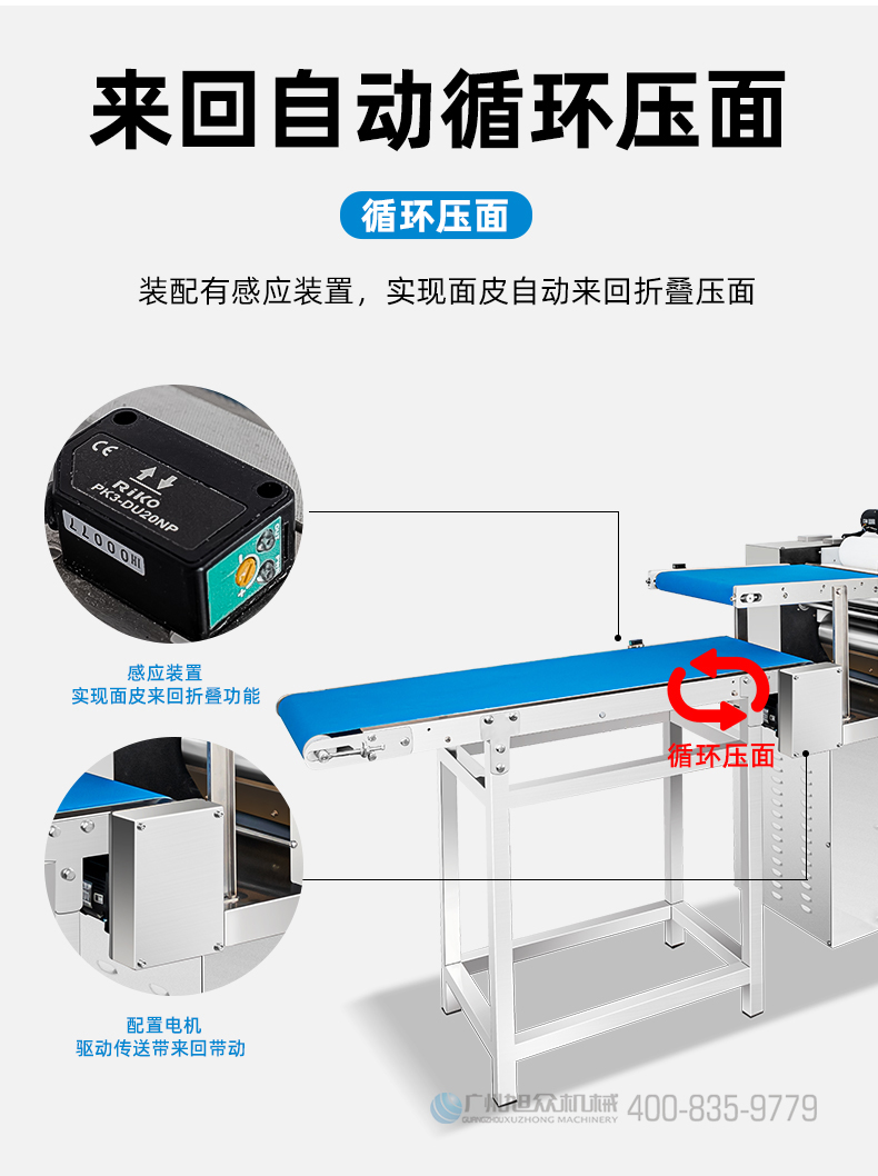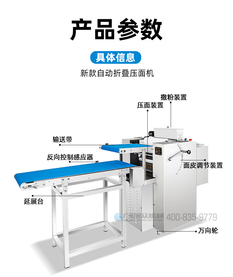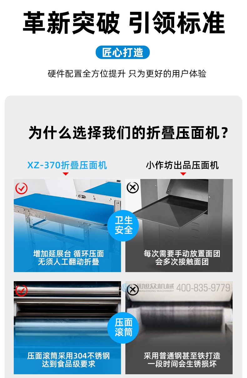 XZ-ZDYMJ370型自動折疊壓面機,整機不銹鋼機身打造,真材實料,選用不銹鋼材質(zhì),打造經(jīng)久耐用、防腐蝕。匠心細節(jié),彰顯品質(zhì)貼心設(shè)計。一鍵設(shè)定壓面次數(shù),智能定時,只需設(shè)定好壓面次數(shù),就能全自動壓面出面。