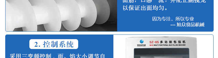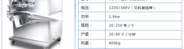 名稱SZ-65型多功能自動包餡機(jī) 電源220/380V 功率1.9kw 產(chǎn)量20-80個(gè)/分鐘 尺寸1130*920*1650mm 重量400kg 規(guī)格20-250克/個(gè) 其他皮餡比例2:8 5:5