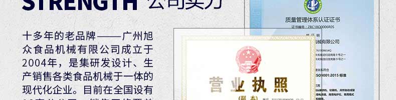 廣州旭眾食品機(jī)械有限公司是一家集科研開發(fā),生產(chǎn)設(shè)計,營銷服務(wù)為一體的現(xiàn)代化生產(chǎn)企業(yè)。現(xiàn)代化生產(chǎn)車間,精湛制造技術(shù),所產(chǎn)機(jī)械歷經(jīng)市場重重考驗(yàn),不斷贏得海內(nèi)外客戶的贊譽(yù)。