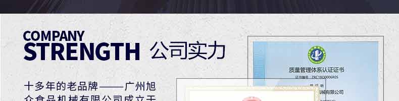 廣州旭眾食品機(jī)械有限公司是一家集科研開發(fā),生產(chǎn)設(shè)計(jì),營(yíng)銷服務(wù)為一體的現(xiàn)代化生產(chǎn)企業(yè)?,F(xiàn)代化生產(chǎn)車間,精湛制造技術(shù),所產(chǎn)機(jī)械歷經(jīng)市場(chǎng)重重考驗(yàn),不斷贏得海內(nèi)外客戶的贊譽(yù)。