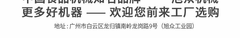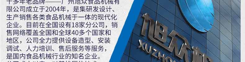 廣州旭眾食品機械有限公司是一家集科研開發(fā),生產(chǎn)設計,營銷服務為一體的現(xiàn)代化生產(chǎn)企業(yè)。現(xiàn)代化生產(chǎn)車間,精湛制造技術,所產(chǎn)機械歷經(jīng)市場重重考驗,不斷贏得海內(nèi)外客戶的贊譽。